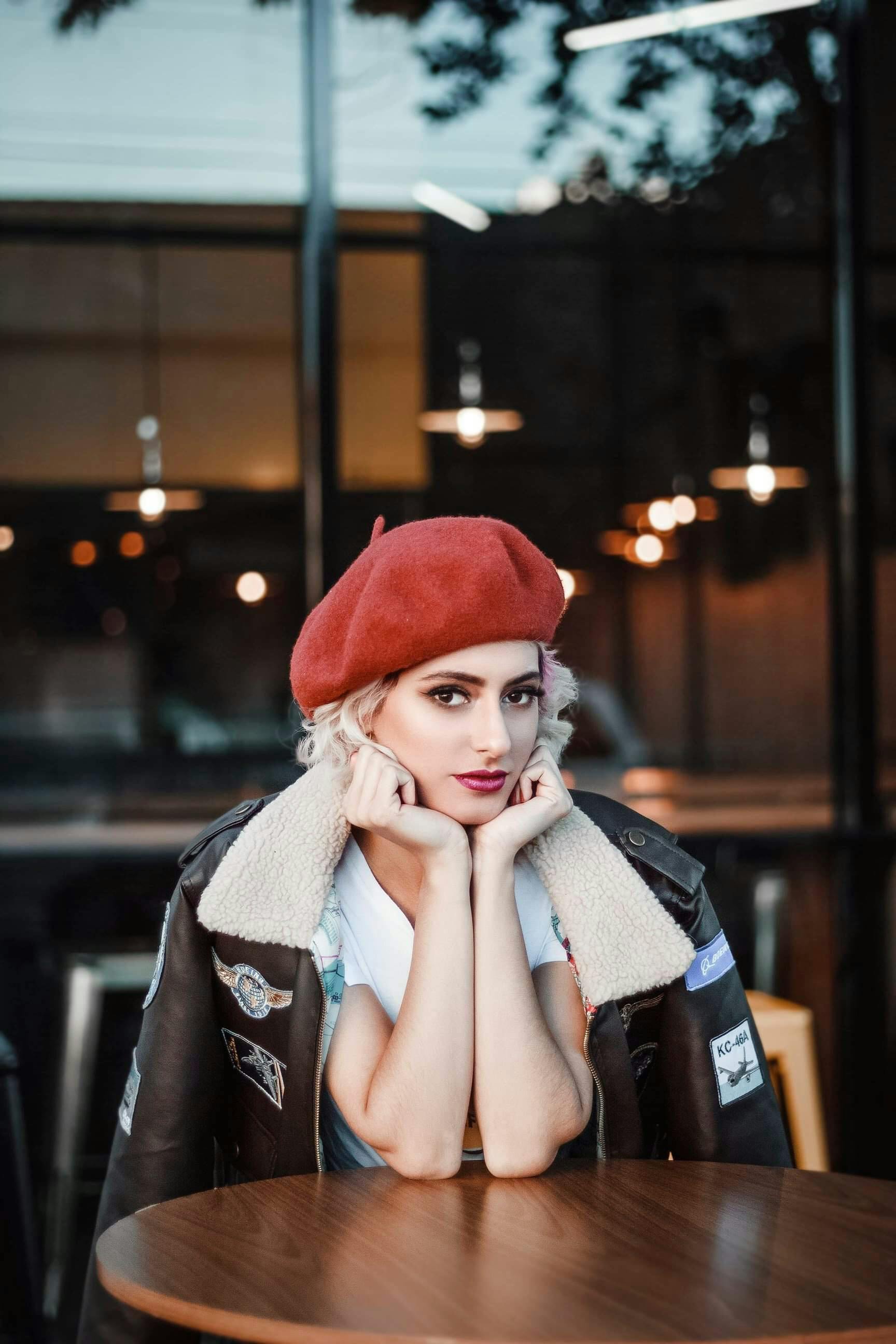 头戴红色贝雷帽的时尚女子,在咖啡馆桌旁摆姿势,散发都市魅力